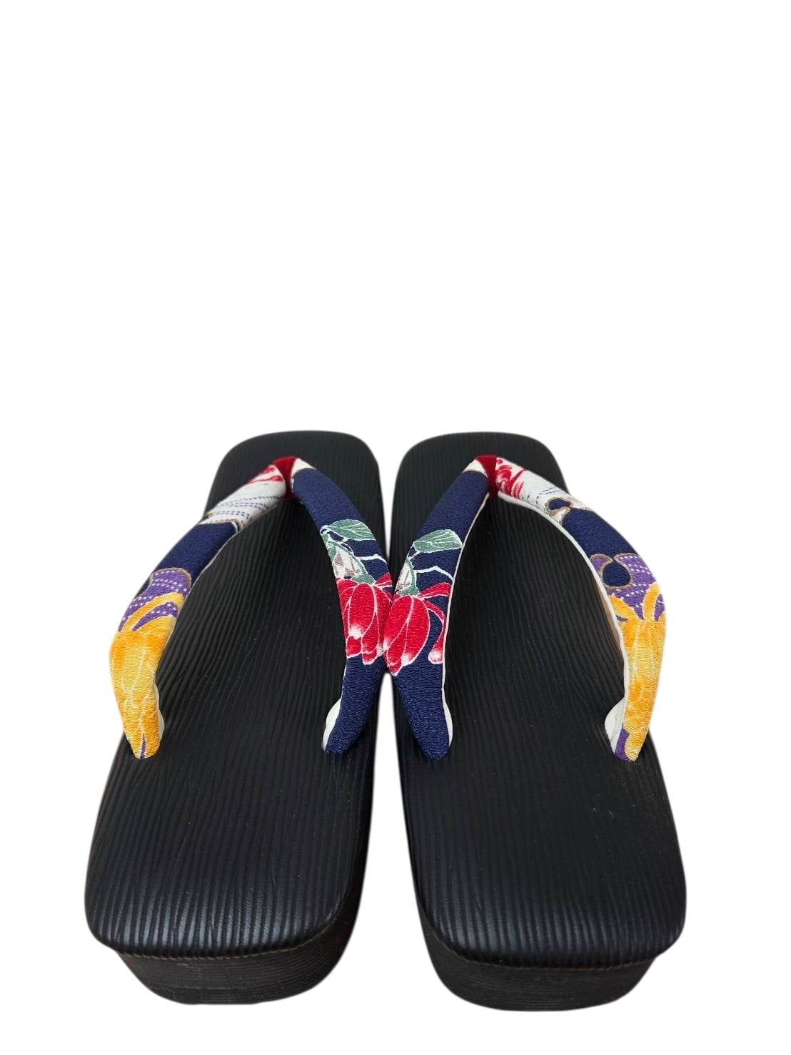 黒の木目調(縦ライン)の台に、ネイビーをベースにした花柄ミックスの鼻緒を合わせた雪駄です。