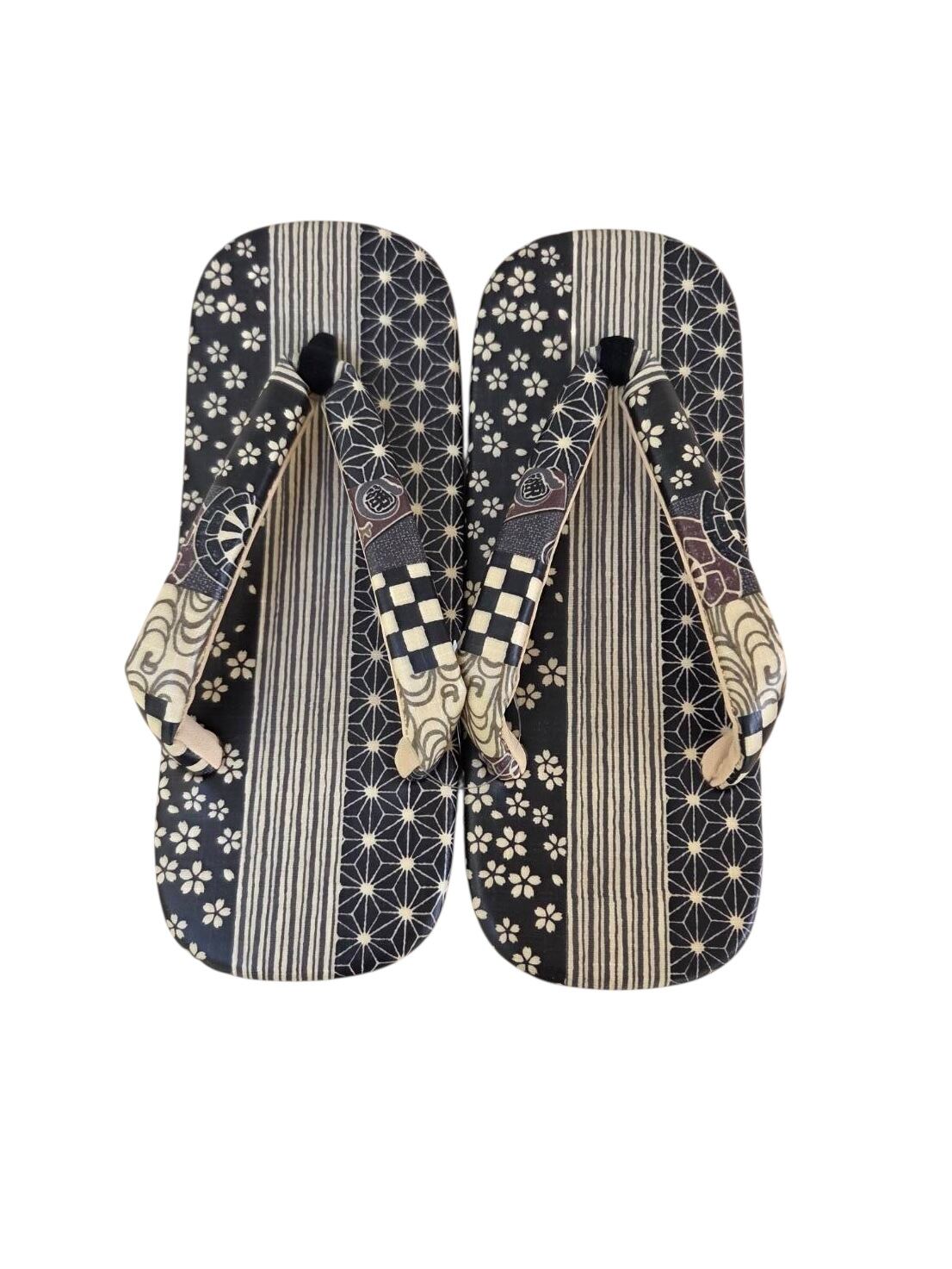 日本の美しさを感じる、【一点もの】和柄雪駄(桜×麻の葉×縞×市松×青海波/黒)が登場しました!華やかな桜や伝統的な麻の葉、縞、市松、青海波の美しい組み合わせが、足元に個性と魅力をプラスします。本牛革の底材と相まって、伝統を大切にしつつもスタイリッシュな一足に仕上げています。浴衣や着物はもちろん、カジュアルな普段着にもぴったり合い、あらゆるシーンで活躍すること間違いなしです。OKURIBIshopが自信をもってお届けする特別な逸品です。