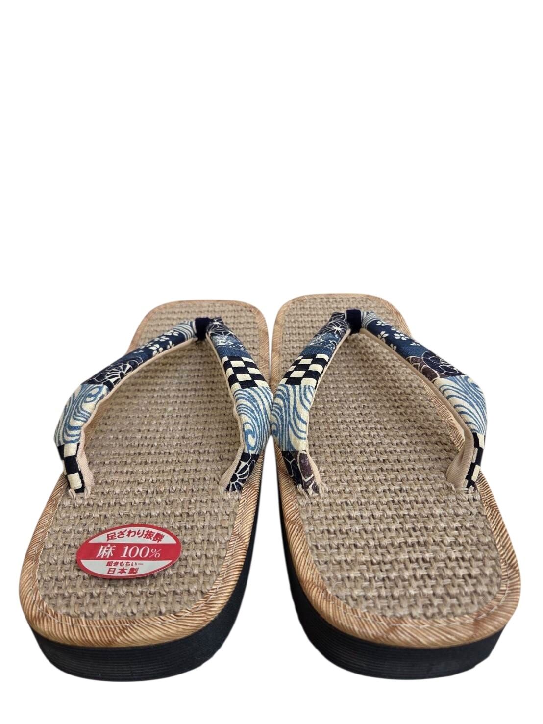 麻100% 麻草履「藍(市松×青海波)」