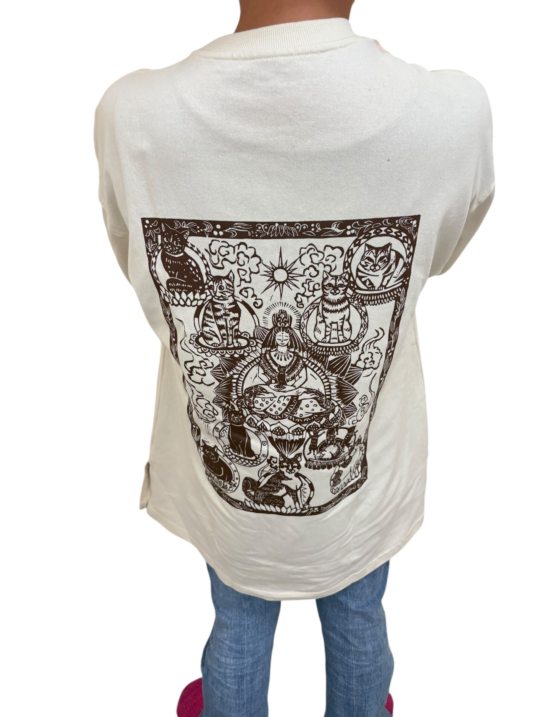 「家族の曼荼羅」Tシャツ。背中に版画を大胆にプリントした、猫11匹、犬1匹の存在感のある一枚です。