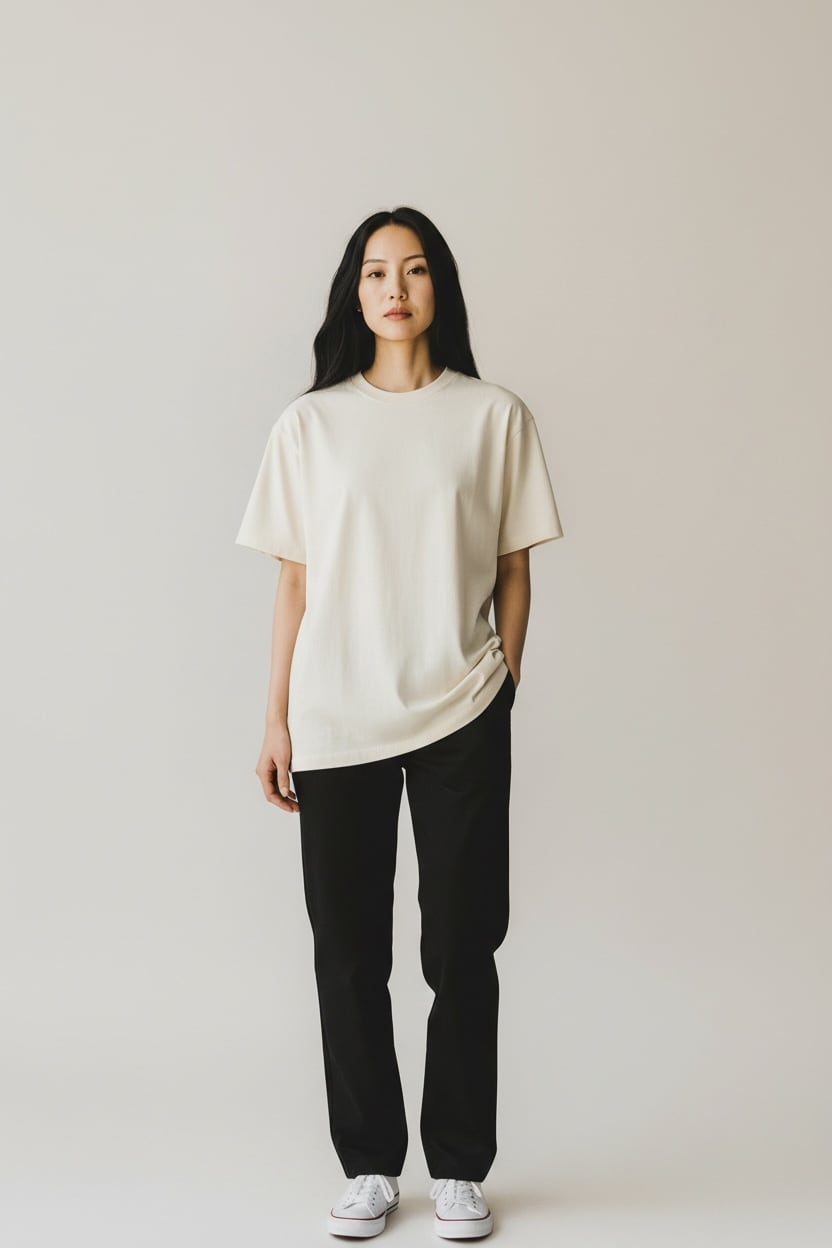 アイボリーでゆったりとしたシルエットで、リラックス感のある着心地。デニムやパンツはもちろん、スカートにも合わせやすく、季節を問わず活躍します。