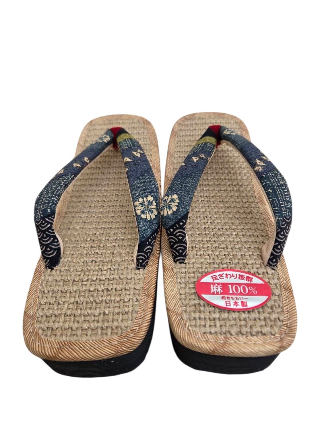 鼻緒は藍ベースの和柄パッチワークに、ちらっと効く**朱(赤)と苔色(グリーン)**がアクセント。コーデを選ばず、普段着にも浴衣にもすっと馴染む一足です。