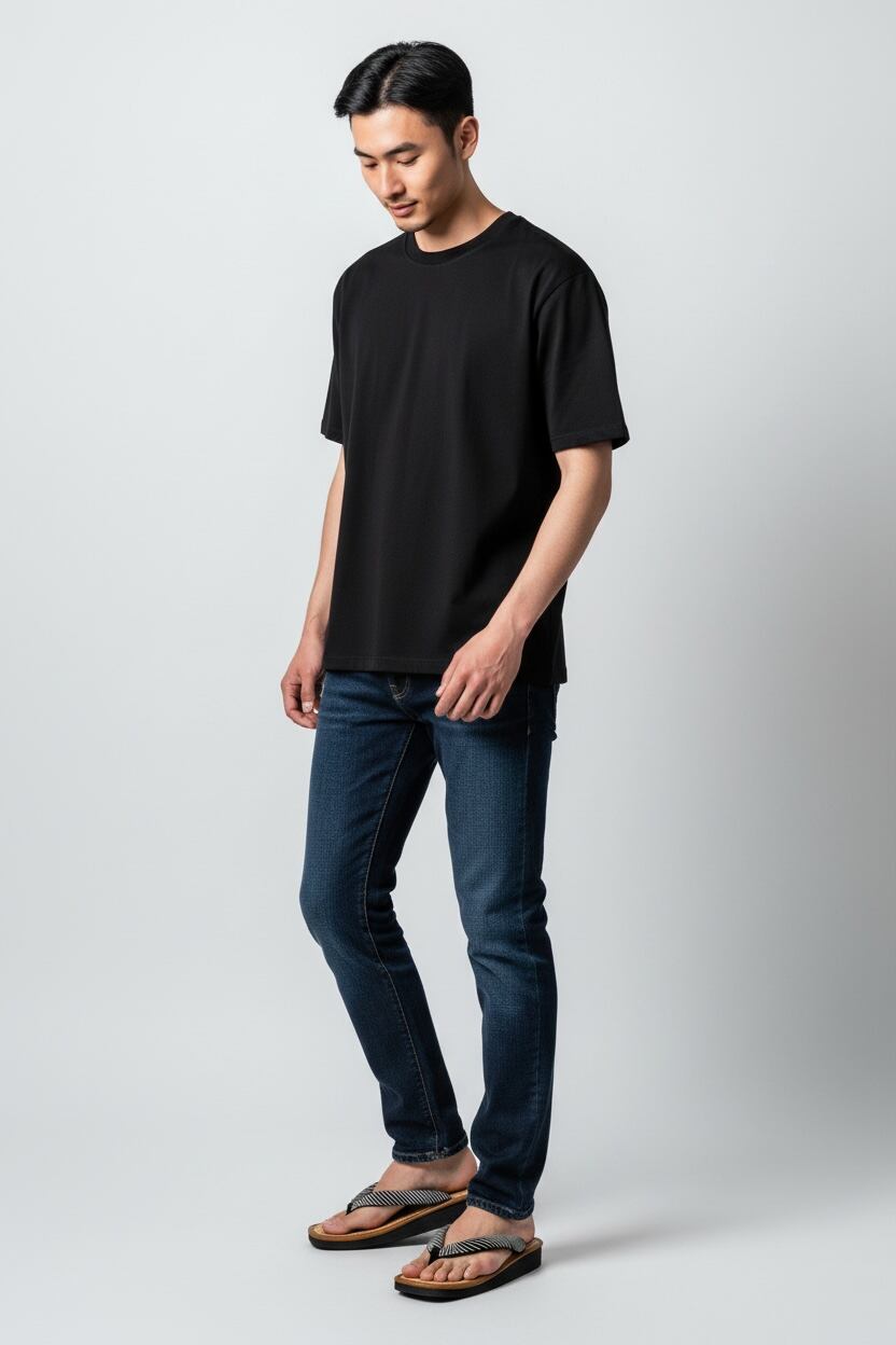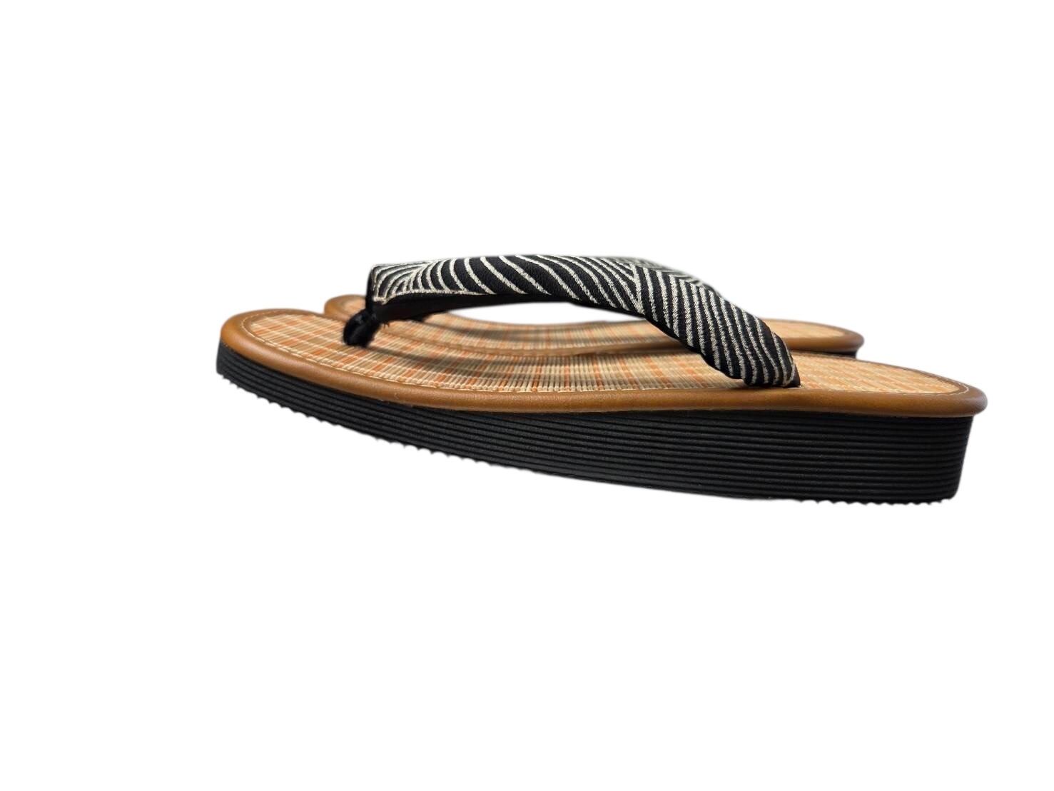 鼻緒は黒×白の斜め縞で、浴衣や甚平はもちろん、デニムなど普段着にも合わせやすい和モダンな一足。