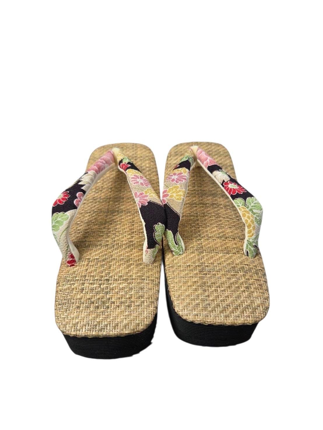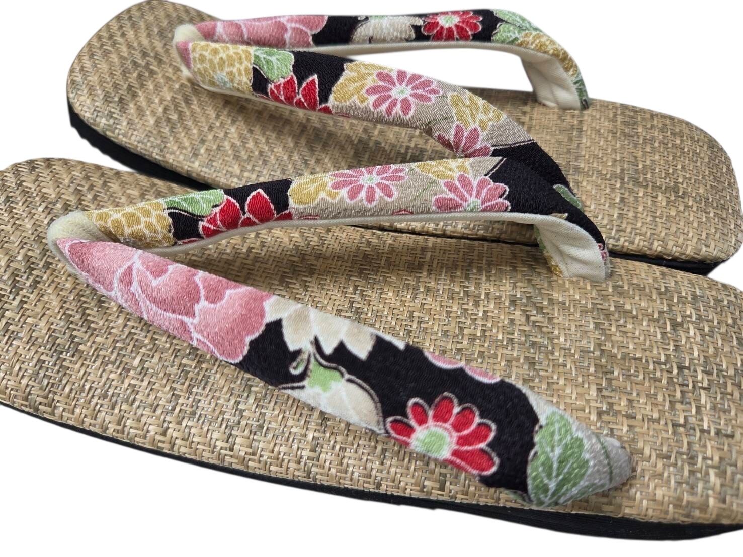 鼻緒には華やかな花柄を採用し、黒地に映えるデザインが特徴。浴衣や着物はもちろん、カジュアルな普段着にも合わせやすいおしゃれな一足です。底はしっかりしたゴム底で、歩行時の安定感も抜群。お祭りや旅行、街歩きにもぴったりのアイテムです。