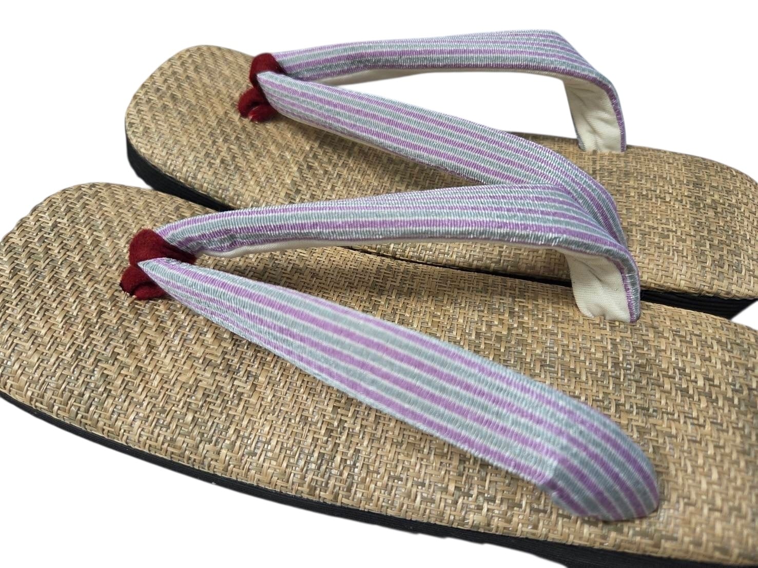 鼻緒には個性的なパープルミントの縞模様を採用し、シンプルながらも目を引くデザインが魅力。和装はもちろん、カジュアルなコーディネートにもぴったりで、幅広いシーンで活躍します。しっかりとしたゴム底は安定感があり、長時間の歩行でも疲れにくいアイテムです。お祭りや旅行、街歩きにもおすすめです!